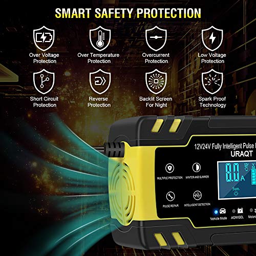 🌟【Veel gebruikt】 De URAQT-autolader is geschikt voor 12V, 24V, 6AH-150AH loodzuuraccu’s (AGM, GEL, MF, SLA, VRLA), die de laadstroom automatisch kunnen aanpassen en gemakkelijk verschillende zware spanningen kunnen weerstaan. can Helpt bij het repareren van lege en sulfatenbatterijen, maar kan niet worden gebruikt om lithiumbatterijen op te laden. Geschikt voor auto’s, motorfietsen, grasmaaiers, boten, enz.
