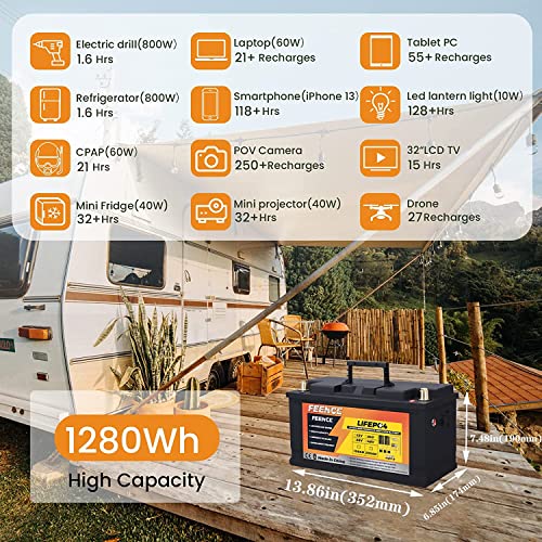 Specificaties: FEENCE LiFePO4 Accu, 12 V, 100 Ah PLUS lithium batterij, 8000 cycli Deep Cycle accu, ingebouwde 100 A BMS LifePO4…