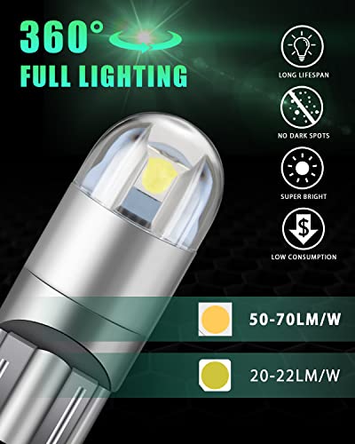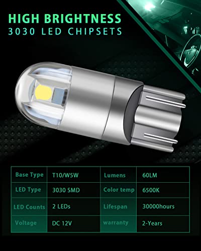 Set van 10 T10 led-lampen: elke lamp heeft 2 stuks van 3030 SMD LED-chips, kan produceren tot 60 Lumen, unieke 360 graden verlichting ontwerp om de helderheid te verbeteren. Werkspanning: DC 12V